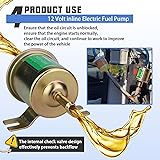 【Specification】Inline Fuel Pump, Output Pressure: 3-6 PSI, Voltage : 12 Volt, Flow Rate : 30 GPH, Hose Size : 8 mm ( 5/16 inch ), Material: Copper Clad Aluminum 【Compatibilty with】Electric Fuel Pump 12v Universal with fuel filter kits, universal for gasoline and diesel (exclude alcohol) engine, fits for Trucks, Carburetor, ATV, Marine, Motor, UTV, All 12 Volt Cars, Boats, Generators, Lawn Mower 【Performance】Low Pressure Fuel Pump, build-in check valve design to prevent back flow, light-weight and small size, plunger-type fuel supply, suction stronger, more stable oil supply, 12 Volt Fuel Pump, two-wire design, can be used as booster, standby unit or as a completely independent fuel pump installation and mounted anywhere 【Easy to install】Light weight, quite operation, easy to fit and connect: 2 bolt fixing, 2 wires design.Upgrade check valve provides optimum traffic, reducing the noise of the pump so we can operate quietly; Fuel filters and hose clamps are required for the use of fuel line, with which can be used perfectly with the electric fuel pump 【3-Layer Thickened Fuel Line】Length: 6.56 feet(2m), Thickness: 2.99mm; Working Pressure: 2MPa/300 Psi; Bursting Pressure: 8MPa/1200 Psi; Cold and High Temperature Resistance (-30°to 120°); The fuel pipeline is made of 3 layers: inner pipe, outer pipe and additional reinforcement layer; Resistant to oil, cold, and ethanol 【Note】Package Include:1 x 12V Electric Fuel Pump;1 x Socket Wire;1 x Fuel Filter;1 x 5/16" 6.56 Foot Fuel Line;10 x Hose Clamp. If you have any questions about our fuel pump, please contact us for a satisfactory solutions