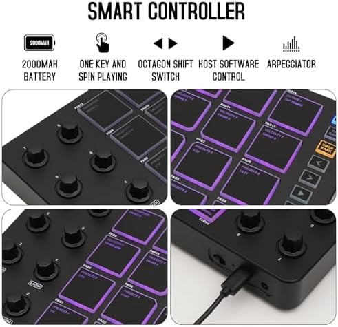 - 【Powerful Controller】 An Essential Tool for Songwriters and Beat Makers, 16 RGB velocity-sensitive pads with aftertouch, Eight sets of 360-degree rotary encoders, Note Repeat function, 3.5mm MIDI outport. ideal for studio and beat production.