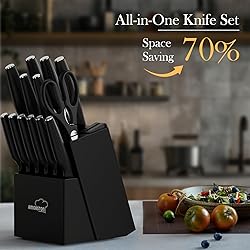 【HIGH-CARBON Steel & Built-in Sharpener for Sharpness】:Crafted from high-grade stainless steel, our kitchen knife set is expertly designed to withstand rust and corrosion, ensuring that your knives maintain their sharpness and pristine appearance over time. This will be the last set of kitchen knife you will ever need. 【Comfortable Grip and Anti-Slip Handle】: Designed with ergonomics in mind, our knife block set is equipped with user-friendly handles that provide a comfortable and secure grip during use. The thoughtful design of the handles enhances the overall cutting experience, making cooking experience a breeze. 【All-in-One Knife Set for Organized Storage】: 15 pieces knife set includes: 8" Chef knife, 8" Slicing knife, 7" Santoku knife, 8" Serrated bread knife, 5" Utility knife, 3.5" Paring knife, 6 Pcs 4.5" serrated steak knife, 1 Pcs kitchen shear, and Black hard wood knife block with built-in knife sharpener. This block enhances safety by reducing the risk of accidents and wear. It also ensures quick and easy access to the right knife, streamlining your kitchen workflow. 【Efficient Cleaning with Dishwasher Safe】: Simply place knives in the dishwasher after use, and let the machine take care of the cleaning process. 【Perfect Gift and Lifetime Warranty】: Our knife set for kitchen is the perfect gift choice for Housewarming, Valentine's Day, Wedding, Birthday, Thanksgiving, Halloween, Christmas. Additionally, our steak knives come with a lifetime warranty that guarantees quality and performance, providing you with peace of mind.