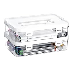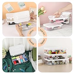 Plastic Plastic Craft Storage Box: Measures by 10.1"x6.3"x2.7"/25.8x16x7cm(LxWxH); and interior size is 9.6"x5.6"x2.2"/24.4x14.4x5.5cm(LxWxH). This size is just right for color pencils, can hold lots of pens, markers and index cards. Clear & Stackable: The sewing box organizer body adopts a transparent design, and the visual construction allows you to easily identify the content without opening the box, so that you can see what you want at a glance, saving time and effort. The top lid and side stacking design make the plastic storage containers easy to stack for saving more space. Multipurpose Art Supply Organizer: This clear plastic craft organizer can be used not only to store small stationery, but also to store sewing supplies such as beads, bobbins, staples and so on. Special as stationery box, sewing box, cosmetic container and office supplies organizer. Can be use in drawers, office, bedroom and any other occasion at your will. Upgraded Design: 1. The plastic boxes are made of high-quality ABS plastic, which are sturdy and durable. The surface is smooth without burrs and not easy to scratch hands. 2. Plastic case with dual snap-shut latches can close tightly to protect items from falling out. 3. Flap lid design, which is waterproof and dustproof, makes it more easy to access. 4. Design with hinge handle, easy to transport. Keep Item Organized: Very suitable to organize craft materials, small items and so much more in the office or at home. These organizer boxes with lid can help you tidy up and store things at home, so you don't have to be upset about organizing craft accessories things.