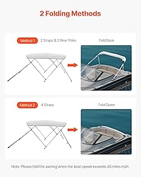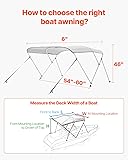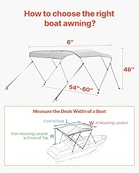 Durable 600D Sunshade Fabric: This boat awning is made from heavy-duty 600D marine-grade polyester fabric, offering excellent UV protection (Sun Shade) and water resistance (>PU1000). The fabric is designed to last longer without fading or cracking, thanks to its high-density weave and double-stitched seams. Ideal for keeping you cool and dry on the water! Wind-Resistant Up to 45 MPH: Built to handle wind speeds up to level 3-4, this boat bimini top features sturdy 1-inch thick aluminum poles and connectors for solid support. No more worrying about it flipping over or swaying in strong winds. Tip: If your boat speed exceeds 45 mph, it’s easy to fold the canopy for security. Foldable & Compact: With two support rods and four straps, you can easily adjust and fold the awning either backward or downward to suit your space. Plus, when you’re done, just store it in the included waterproof and dustproof bag for neat, hassle-free storage! Quick & Easy Setup: Installation is a breeze with the aluminum alloy frame, pre-drilled base, and adjustable nylon straps. Whether you have a pontoon, canoe, aluminum dinghy, or fishing boat, this bihimi top fits easily on most boat types, getting you back to enjoying the water in no time. Choose Your Ideal Size: Available in a variety of sizes, including 3 Bow 6'L x(54"-60")W x 46" H. Simply measure your boat’s deck width and pick the awning that fits your boat.