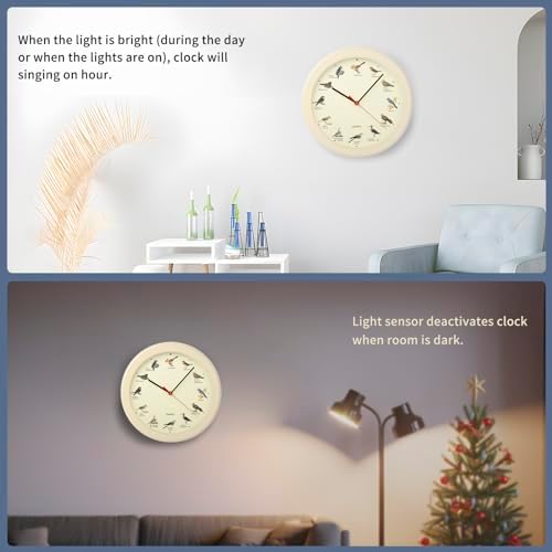 13 Inch White Bird Singing Clock for Home or Office Room Decorative The second hand quiet sweeping, ensures a good sleeping and working environment. Size measures: 33x33x4cm(13x13x1.57inch). Color: white wood grain. The wall clock has holes in the back, which is easy installation and hanging. Light sensor deactivates clock when room is dark. Enjoy the bird singing in the day, and quiet in the night! Followed these Step Exactly to Ensure That The Correct Sound is Heard For Each Hour: 1. Remove batteries. 2. Set clock to 12:30 3. Insert 3 AA batteries with the correct polarity(+/-) 4. Advance the dial clockwise to the desired time. (Please note, each time the test button is pressed, the next hour's sound will play. If pressed, please repeat steps 1-4 to ensure you hear the correct sound on the hour.) Hear The Distinct Bird Singing 12:00 = Pyrrhuloxia, 1:00 = Field-Sparrow, 2:00 = Common Ground-Dove, 3:00 = Blue-Jay, 4:00 = American-Kestrel, 5:00 = Common Greenshank, 6:00 = Common Cuckoo, 7:00 = White-breasted Nuthatch, 8:00 = Tuffted Titmouse, 9:00 = Northern Pygmy-Owl, 10:00 = Whip-poor-will, 11:00 = Downy Woodpecker As the design of this bird clock is set by manually. If there are any issues during the setup process, please carefully according to the step set.