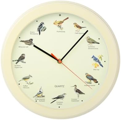 - Singing bird clock includes twelve beautiful songs at the top of each hour. Bird clock with great looking clock face and white wood grain frame which is perfect for your living room, bedroom, kitchen, classroom, office room or even outdoor garden decorative, it's singing sounds like just being in the forest.