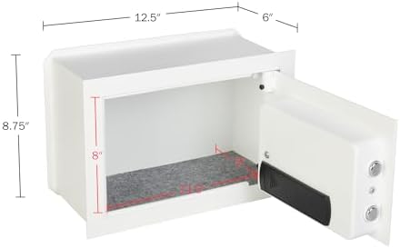 - PRODUCT DETAILS - Materials: Cold Rolled Steel. Dimensions: (L) 12.5” x (W) 6” x (H) 8.75”; Interior: (L) 11.5” x (W) 5” x (H) 8”; Wall Thickness: 1.5mm; Door Thickness: 3mm; Weight: 12lbs. Includes Home Safe and Emergency Keys and Manual. Color: White.