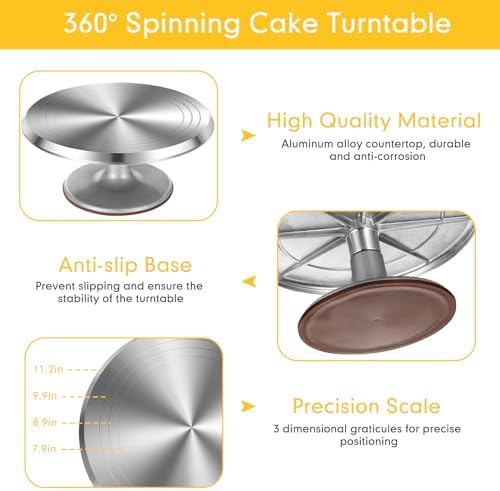 - 360° Rotating Cake Turntable: the 12 inch diameter cake decorating turntable is made of quality aluminum alloy, ensuring durability and smooth rotation on concealed ball bearings; This feature allows for easy and precise cake decorating from most angles, making the process efficient and enjoyable