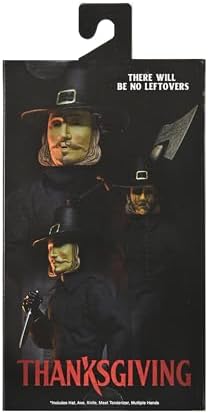 This year… There will be no leftovers. A masked killer terrorizes Plymouth, Massachusetts in Thanksgiving, the Eli Roth-directed horror flick that originated from a trailer in the film Grindhouse. This 8-inch Thanksgiving John Carver action figure is fully articulated and features tailored fabric jumpsuit, two interchangeable masks, removable hat, axe, meat tenderizer, and knife. Comes in window box packaging.