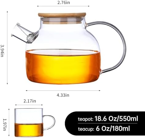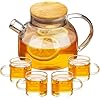 Glass Teapot Set of 5 with Bamboo Lid, 4 Teacups, 18.6OZ. Thick Durable Borosilicate Glass for Cold Brewing, Hot Tea