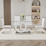 Ebullient Glass Dining Table Set for 4 ,5 Piece Dining Table Set,Tempered Glass Table Top,White Modern Dining Room Table with 4 PU Leather Ergonomic Dining Chairs