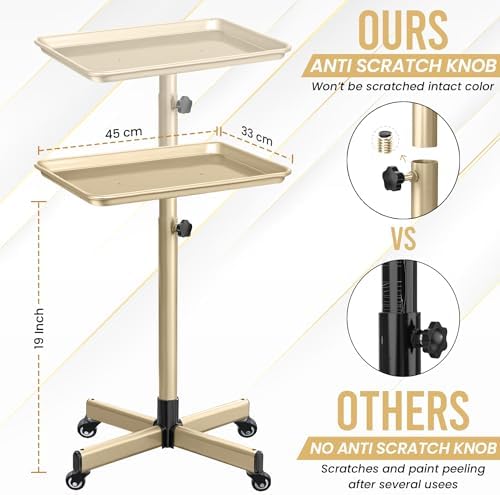 - 🌟 [Free Height Adjustment Tray]: This tray on wheels features an anti-scratch tension knob on the pedestal, which makes the height fully adjustable from 27.5" to 43.3" and makes it easy to meet your unique needs. This flexible and personalized design boosts work performance, efficiency and is perfect for use in hair salons, nail salons, tattoo studios or home bathrooms.