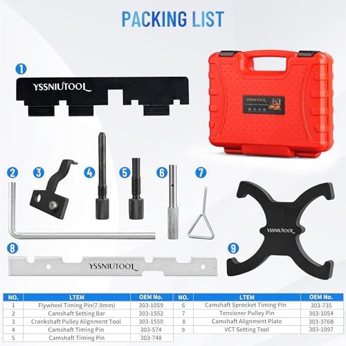 - Included in this package:Camshaft Setting Bar 303-1552,Crankshaft Pulley Alignment Tool 303-1550,Camshaft Timing Pin 303-748,Camshaft Sprocket Timing Pin 303-735,Camshaft Timing Pin 303-574,Camshaft Alignment Plate 303-376B,VCT Setting Tool 303-1097,Tensioner Pulley Pin 303-1054,Flywheel Timing Pin(7.9mm) 303-1059