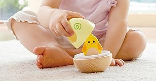 DISCOVER THE HIDDEN CHICK: To find the chick hidden inside the egg, toddlers need to use their fingers to twist off the three different eggshell layers, which helps to develop their hand muscles and fine motor skills. VISUAL DEVELOPMENT: With a cute chicken and egg design, this toy will be a sensory companion to your baby as they learn to track movements and identify objects with their eyes. 2-IN-1 FUN: Curious minds will be attracted to this toy’s roly poly wobbling, and once they get it in their hands, see the amazement in their eyes as they remove the layers and watch the chick jump out of the shell. TUMMY TIME PAL: This wobbler and stacker is ideal for babies during tummy time as they can practice reaching and pulling themselves up. BABY-FRIENDLY FEATURES: The rounded body of this toy ensures it’s safe for little hands to grasp and its balanced, durable design withstands batting and pushing.