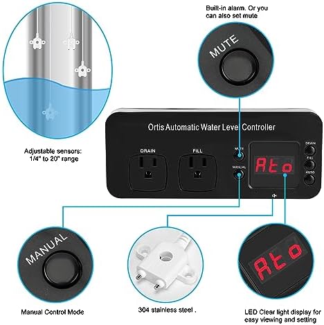 - HI-LO DUAL SENSORS NEW UPGRADED: The sensors use a patented water level detection method to keep the electrodes intact for 10 years. It is made of 304 stainless steel and will not affected by minerals or water debris. It is highly resistant to corrosion and never needs cleaning. Also the heights of the two sensors are adjustable. The Ortis water level controller has completely overcome the shortcomings of traditional mechanical float switches that are prone to mechanical failures