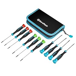 Robust construction: The screwdriver shafts are crafted from Cr-V steel for long lifespan and reliability. Handles are made of PP+TPE material with a non-slip design for a comfortable grip, making this precision screwdriver set ideal for intricate tasks Convenient Design: Magnetic tips attract and hold tiny screws to prevent loss. 360-degree rotatable top caps enhance flexibility, while color-coded handles help quickly identify the right tool, setting this small screwdriver set apart Portable and Organized: The included storage pouch neatly organizes all components for easy portability, ensuring the mini screwdriver set remains compact and efficient for various tasks Versatile and Comprehensive: This screwdriver set includes 10 sizes: 4 Slotted (1/16", 5/64", 3/32", 1/8"), 3 Phillips (PH000, PH00, PH0), and 3 Torx (T7, T8, T9) screwdrivers, covering a wide range of needs and meeting the demands of both professionals and DIY enthusiasts Wide Applications: Perfect for repairing glasses, watches, phones, computers, and jewelry, this precision screwdriver set is indispensable, offering versatility and precision in various fields