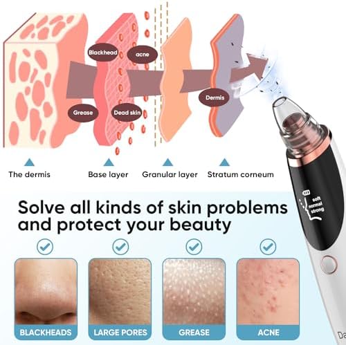 - Personalized for Every Skin Type – Blackhead Remover Tools & Pore Extractor With 3 adjustable suction levels and 5 interchangeable tips, you can tailor your treatment to sensitive, normal, or oily skin. Each tip targets specific concerns: blackhead extractor for stubborn spots, exfoliating dead skin, and smoothing fine lines. Over 90% of users reported visibly smaller pores after 2 weeks of twice-weekly use.