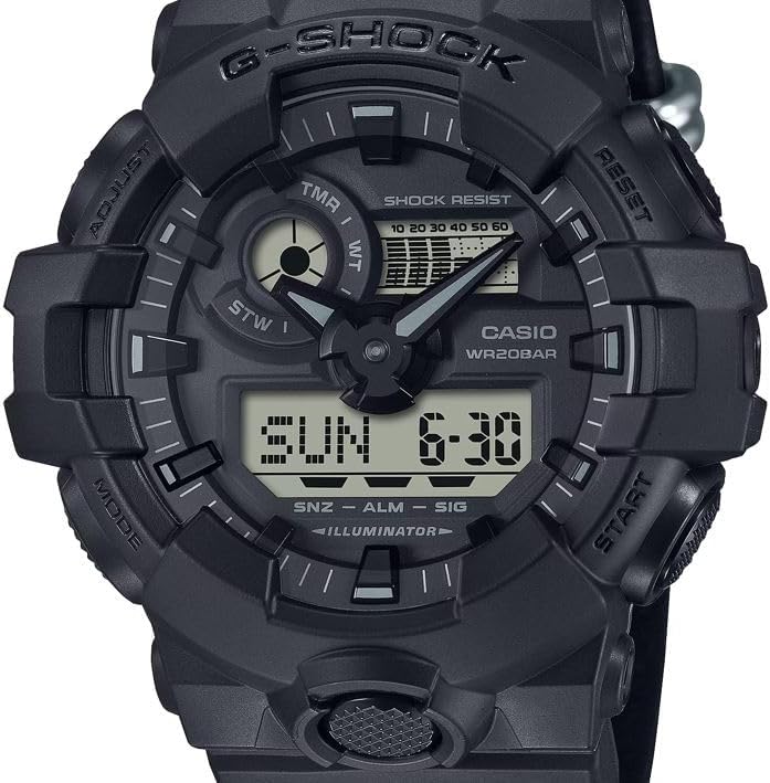 The GA-700BCE-1A by G-SHOCK is a digital-analog watch model, equipped with an eco-friendly Cordura nylon band. In all black tones, this G-SHOCK adds a touch of street-smart utilitarian style to your wrist.