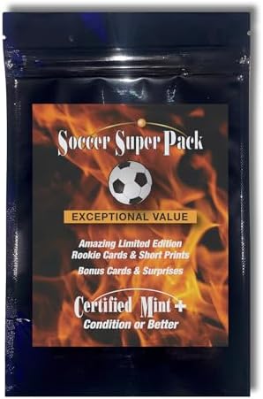 Our newest offering, a SuperPack of some the most popular soccer cards we have ever sold. Every single card is a short print special edition, a rookie card, or both. Includes 8 cards and at least 1 bonus card. All cards are Certified Mint+ condition but take note that these cards are not individually sealed. Certified Mint+ cards are uncirculated collectibles that have never been handled.