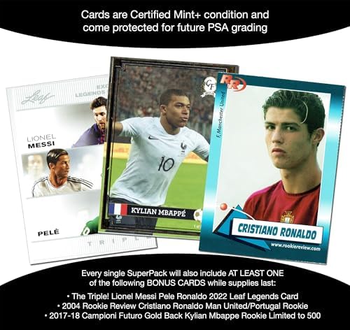 - EVERY SUPERPACK WILL ALSO INCLUDE AT LEAST 1 of the following BONUS CARDS: The Triple! Lionel Messi Pele Ronaldo 2022 Leaf Legends Card... OR... 2004 Rookie Review Cristiano Ronaldo Manchester United/Portugal Rookie... OR... 2017-18 Campioni Futuro Gold Back Kylian Mbappe Rookie Card Limited to 500 Released.
