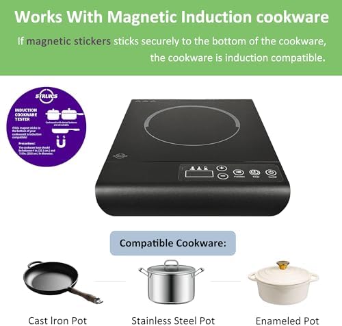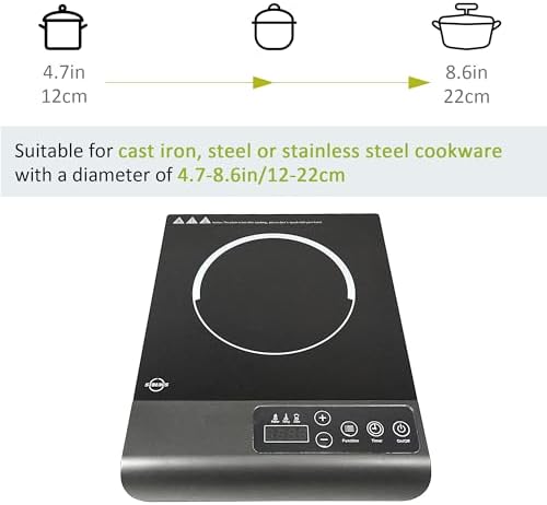 - Magnetic cookware: The induction cooker can be used with magnetic induction cookware such as cast iron, iron, steel and enameled iron. Suitable for pots with a diameter of 4.7" (12cm) or more, ensuring a large and even heating area. If no cookware or incorrect cookware is detected, the device will automatically shut off.