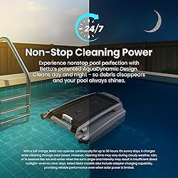 - The Betta SE Plus, an upgraded model from the Betta SE, offers dual charging options, solar power and AC adapters, for consistent operation in any weather. Its innovative Aqua Dynamics design ensures exceptional efficiency, allowing continuous cleaning for 30 hours or more on a single charge, even during rainy or cloudy days. With its shallow water safeguard design, it suits various pool types. Equipped with twin Salt Chlorine Tolerant (SCT) Motors, it effectively removes debris like leaves, dust, pollen, insects, and pet hair. Featuring smart auto-cleaning and cordless design, it includes a wireless remote control for easy mode switching and a large fine-mesh (200 um) debris basket with a convenient top handle for effortless emptying.