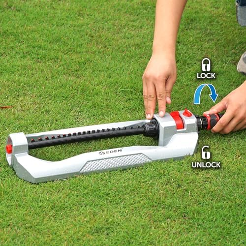 Experience unmatched durability and control with the metal base of Eden 20 Nozzle 2-Way Oscillating Sprinkler, offers a turbo drive motor and 20 precision drilled nozzles to deliver consistent watering for lawns, vegetable gardens, and flower beds. Adjust the rectangular spray pattern to achieve superior coverage up to 3,778 sq. ft. (350m²), providing thorough watering for medium-large lawns or smaller garden areas. The patented sealed turbo drive motor ensures smooth operation, delivering reliable performance and a longer gear life. Say goodbye to clogged nozzles with the built-in cleaning tool, allowing for years of hassle-free operation. Adjustment levers are easy to use to provide precision watering– from a large lawn to a smaller garden. The flow control knob regulates water pressure. Our patented, sealed turbo drive ensures smooth operation regardless of water pressure for years of reliable performance. The included Quick Connect Starter Set allows you to easily disconnect/reconnect the sprinkler or other watering tools. The lock feature secures the sprinkler in place, preventing any accidental detachment. Use the additional Product Adapter for your nozzles, wands, or other watering tools to switch between tools, even with the water running. Transform your lawn and gardens into vibrant, lush spaces with the powerful and efficient Eden Metal 20 Nozzle 2-Way Oscillating Sprinkler.