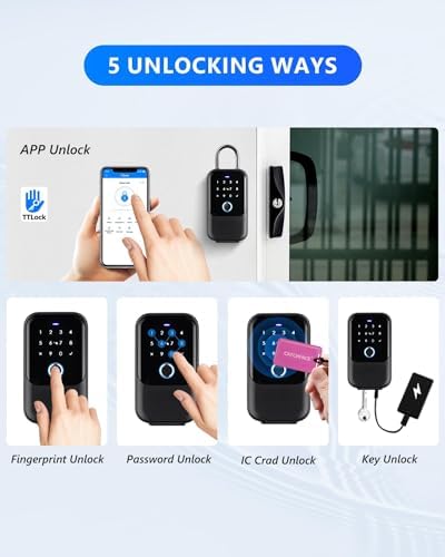- 🔒【Multiple Ways to Unlock】Manage your smart keybox with the free TTLock App + Advanced 3D fingerprint sensor + Touchscreen keypad with backlight and Anti-peep virtual password (6-9 digits) + Smart cards(5 include)+Physical Key(2 include)