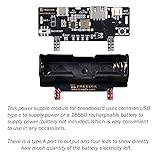 Breadboard Power Module: the module is designed for the convenience of experiments on the breadboard, onboard 3.3V, 5V DC output pin charging mode. Improved Charging Modes: You can use USB-C to directly charge the module and power the breadboard, or insert the rechargeable batteries into the battery slot of the module. Power Display: there are four led lights to show the remaining power, which is convenient for you to check the power and ensure the normal progress of the experiment Maximum Output current: 2.4A, but considering the module heating problems and life problems, we very recommend you to use under 2A. The output voltage is 3.3V or 5V. Application: the power module is widely used in MCU, electronic building blocks, intelligent cars and other power supply extensions. It comes with USB Type-A interface for the power output of external devices, and can also be used as a mobile power supply for other devices.