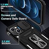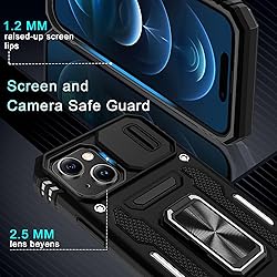 Compatible with: Armor Case with sliding camera cover specially designed for iPhone 15 6.1 Inch. NOT fit for other device! The precise cut out fits each button,camera,speakers and ports precisely,easy to press and access Military Grade Protection: Double layer shockproof case made by TPU and PC.This multi layer cushion structure provide additional shock absorption protection.Certified by the Military Standard.The flexible TPU interior absorbs impacts from inside.In addition,exterior with four reinforced corners can effectively absorb the impact of falling Camera and Screen Protection: Sliding camera cover protect for phone camera lens from getting scratched and scuffed.Subtly enhanced 1.8 mm screen lips and glass screen protector provide the screen extra and comprehensive protection.Ensuring every aspect of your phone is protected with uniquely Magnetic Ring Kickstand: Newly upgraded multi function case built in ring kickstand and metal patch.Rotating ring provide two stand modes for vertical horizontal viewing,so it can be used as ring holder and release your hand when watching video.The Metal Patch back easily attach to magnetic car mount,very convenient during driving time for navigation.You will love how convenient it is with such powerful functions What's in the Package: The package come with 1 pack phone case,2 pack tempered glass screen protectors and 2 pack Cleaning Kits. Notice: Due to the metal ring on the back,the case will NOT work with Wireless Charging function directly
