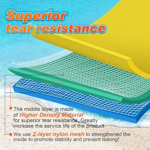 - Safe & Long-lasting: After months of comparing materials and thousands of tests, we have finally found a way to improve the performance and service life of our lily pad floating mat - The middle layer is made of Higher Density Material with 2-Layer nylon mesh to strengthened the inside to promote stability and prevent tearing. Made of 1.3 inches tear resistant & UV-resistant 3-layer XPE foam, make sure you will enjoy happy summer moment for years to come!