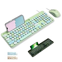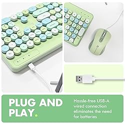 - Bring Nostalgia to Your Workspace with the Retro Backlit Wired Keyboard and Mouse Combo Add a nostalgic touch to your workspace with this Retro Backlit Wired Keyboard and Mouse Combo. Featuring vibrant, round typewriter-style keycaps, this combo merges timeless vintage charm with modern functionality. The keyboard offers a soft white backlight with three adjustable brightness levels, making it perfect for typing in dim environments or late at night. Its full-sized layout includes 109 keys and 13 multimedia hotkeys, ensuring seamless productivity for both work and play. The built-in phone dock keeps your smartphone conveniently accessible, while the silent keys on the green keyboard provide a quiet and comfortable typing experience. Paired with an ergonomic wired mouse featuring adjustable DPI levels (1200/1800/2400/3600), this combo ensures precision and efficiency for any task. With a hassle-free wired connection, you’ll enjoy reliable performance without the worry of batteries. This combo is compatible with Windows PCs. Keyboard Features: Backlight: Soft white with 3 adjustable brightness levels Layout: Full-sized (109 keys) with 13 multimedia hotkeys Key Design: Round, typewriter-inspired colorful keycaps Keystroke Sound: Silent keys for quiet operation Additional Feature: Built-in phone dock for convenience Dimensions: 16.96" x 5.78" x 1.35" Mouse Features: Buttons: Left and right-click Scroll wheel DPI button (1200/1800/2400/3600) Forward and back buttons for browser navigation Sensor: Optical for smooth and precise tracking Connection: Interface: Wired USB-A (Plug & Play, no drivers required) Cable Length: 1.5m (USB-A to USB-C cable included) Upgrade your workspace with this typewriter keyboard and mouse combo, blending vintage charm with modern functionality. The retro keyboard and mouse set features round keys and a colorful design with vibrant pastel tones, including stylish green and sage hues, adding a cozy aesthetic to your desk. Perfect for work or play, its ergonomic design ensures comfort and precision. This cute keyboard and mouse combo offers soft backlighting and bubble-like keycaps on the usb keyboard and mouse combo for a delightful typing experience. Whether you need a keyboard to brighten your setup or a pastel option in warm, earthy tones to match your style, this colorful keyboard and mouse set delivers on both looks and functionality.