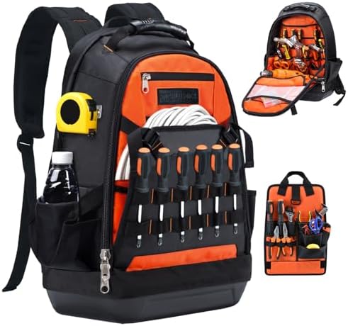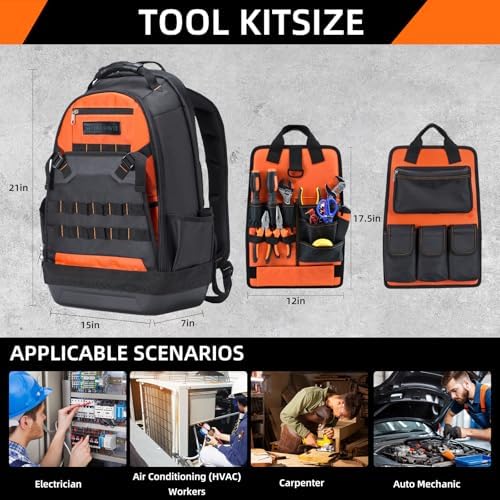 - 【Wide Versatility】: Hvac tools tactical backpack with external metal tape measure clip and adjustable front pouch for quick tool retrieval. Orange interior to help find tools faster. Tool backpack ideal for electrician, HVAC, cable repairman, plumber, carpenter, home DIY, and more. Fits in all cars/trucks/van/motorcycle