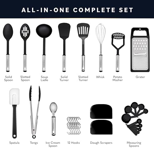 - Worth the Investment - This all-in-one high quality black utensil set includes: 1 Ice Cream Spoon, 1 Spatula, 1 Grater, 1 Whisk, 1 Potato Masher, 1 Set of Tongs, 1 Solid Spoon, 1 Soup Ladle, 1 Slotted Turner, 1 Solid Turner, 1 Slotted Spoon, 5 Measuring Cups, 5 Measuring Spoons, 12 Hooks, 2 Dough Scrapers