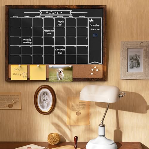 ARCOBIS Chalkboard Calendar with Cork Board, 24x18 Inch Wood Frame Bulletin Board for Wall, Magnetic Chalk Calendar Board with Chalk Markers, Push-Pins and Magnets