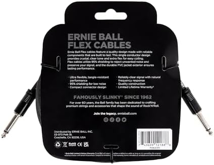 Ernie Ball Flex cables feature a quality design made with reliable components that are built to last. This single conductor design provides crystal, clear tone, and extra flex for easy coiling. Flex cables utilize 95% shielding to reject unwanted noise and preserve your signal, and the durable PVC jacket exterior ensures lasting performance.