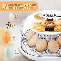 - 🐣【Effortless Automation, Transparent Observation】Our incubator ensures perfect conditions for growth and hatch success, maximizing productivity. It can hold up to 12 chicken or duck eggs, or 24 quail eggs. Without the need to open the incubator, you can observe the mesmerizing journey of your eggs as they progress day by day. It's both educational and fascinating for kids and curious individuals! 🐣【Automatic Egg Turner Every 2 Hours】Say goodbye to manual egg-turning tasks! Our incubator is equipped with an automatic egg turner that replicates the natural behavior of a hen carefully rotating its eggs, promoting the healthy development of your fertilized eggs. Remember to remove the turntable in the last 3 days to stop spinning the eggs. 🐣【Auto Water Refill, Easy Humidity Control】The external automatic water supply bottle ensures a consistent and optimal water level. Refill water without opening the incubator lid, preventing temperature fluctuations inside the machine. In humid weather, there is the option to temporarily remove the water bottle to moderately reduce humidity. 🐣【Digital Temperature Control, Temperature Alarm】Our egg incubator is equipped with an advanced digital temperature control system that allows for precise temperature adjustments and control. The straightforward button operations streamline the incubation process, making it easy for even children to learn. It also features a temperature alarm function that alerts you when the temperature falls below or rises above the set range. 🐣【Advanced 360° Airflow Circulation】Our innovative airflow system guarantees a consistent and uniform distribution of temperature and humidity during the entire incubation process, establishing an ideal environment for your eggs to thrive. It eliminates any potential hotspots or cold spots that could endanger the embryos. 🐣【Detachable Design, Easy to Clean】The incubator's detachable design with removable trays makes cleaning a breeze. Just take out the trays, wash them in the sink, and effortlessly wipe clean the machine cover and circuit components. Say goodbye to struggling with inaccessible corners or complicated cleaning procedures! Please do not put the egg tray in the dishwasher for cleaning, as it may cause deformation. 🥚🐣【Worry-Free Purchase】-- Our egg incubator set includes incubator, water bottle, spray bottle, foam box, egg candler, power cord, chicken feeder,user manual. 🎁🎁Supporting 90-day returns & exchanges, 36-month warranty, 24-hour quick response and technical support, we are committed to providing high-quality products and high standards of customer service so that you can purchase without any worries. You can fully experience the joy of giving birth to a new life.