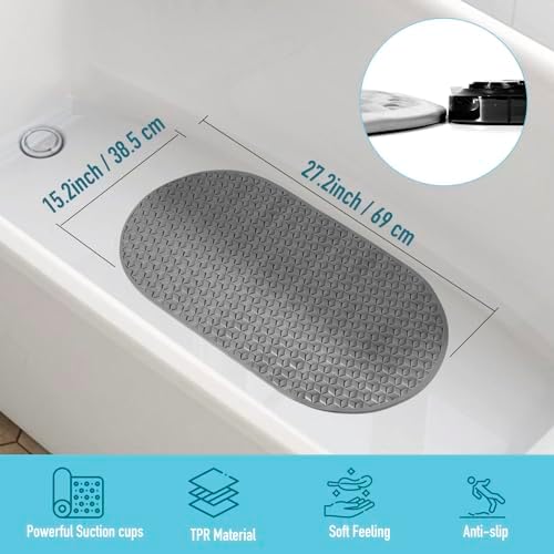 Non Slip Bath Mat with 112 Suction Cups and Non-Smell Extra Soft TPR Material and Drain Holes, Machine Washable Bathroom Shower Mat for Kids and Seniors, 27" x 15" Gray