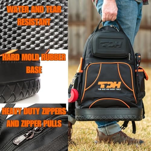 - Strong and Built to Last: This Construction tool backpack is made from tough 1680D Oxford fabric, this water-resistant tool backpack is designed to handle everyday use. It has smooth, heavy-duty double zippers for easy opening and a strong molded base that keeps it steady. This makes it perfect for tough job sites and bad weather.