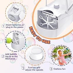 【Safety Material】High output bubble blower made from durable and safe ABS thermoplastic polymer and this bubble machine with official CPC toy Safety Certification that won't harm kids,toddlers ,pets and adults. 【18,000 Big Bubbles Per Minute】Sizonjoy Bubble Machine Can Generate More Than 18000+ Big Bubbles Per Minute with 6 Spinning Wands,2 Speed Level & Super Built-In Motor. 【Fully Automatic Endless Bubbles】Sizonjoy bubble machine has two speeds that can be adjusted, the first speed produces 5,000 bubbles per minute and the second speed produces 18,000 bubbles per minute. No need to add bubble solution multiple times, kids can have uninterrupted bubble fun. 【Large Capacity】320ml/11.26 oz Capacity of the liquid tank.Suitable for any occasion and 30+minutes of continuous use allows you and your family to enjoy uninterrupted bubble recreation time. 【Wonderful Idea】This bubble machine for parties is designed for kids and pets. Outdoor toddler girl toys can add fun to the game and bring kids into a fantastic bubble world.Great for creating a fantastic and romantic atmosphere indoors or outdoors (yard, park), such as weddings, stages, parties and camping etc. 【Three Power Options】Experience the versatility of our bubble machine with three power options:①USB plug in②Use 4 batteries(Not Included)③USB cable and adapter plug in(Included UL& FCC adapter and USB cable). 【Easy & Portable】Light weight and portable, easy to carry. Our bubble machine is versatile,can be used for a variety of activities. 【Note】Please use bubble solution specifically designed for bubble machines. Do not substitute it with dish soap or laundry detergent mixed with water, as this will significantly affect the bubble output performance.