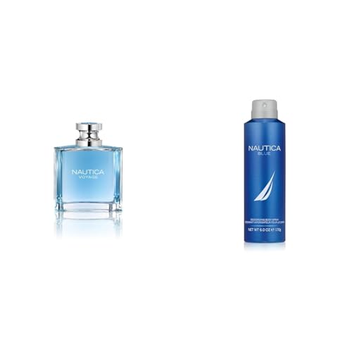 Nautica Voyage Eau De Toilette for Men - Fresh, Romantic, Fruity Scent Woody, Aquatic Notes of Apple, Water Lotus, Cedarwood, and Musk Ideal Day Wear 3.3 Fl OzA blend of apple and water lotus laid on a woody base, combined of cedarwood, musk, and amber.Nautica Blue Deodorizing Body Spray - Iconic, Vegan Formula, Deodorant Spray, Refreshing Bergamot and Earthy Sandalwood, 6.0ozThere's something enticing about the Nautica Blue Man: a man whose passion for life invigorates all those around him. Sporty and timeless, Nautica Blue Body Spray for Men is about more than smelling good - it's about harnessing a man's signature energy to inspire the world around him. This lively deodorant spray for men features a clean, refreshing fougère blend of bergamot, waterlily, and earthy sandalwood. The perfect men's fragrance for dreamers, explorers, and men who see adventure at every opportunity. - Sporty and refreshing fragrance mist with bergamot and waterlily - Long-lasting scent with a complete perfume blend rounding into earthy sandalwood - Nautica Body Spray for Men makes the perfect gift for the men in your life - Nautica Blue: the energizing, crisp scent that gets compliments every time - For adventurers: men's body spray perfect for every occasion, day or night.
