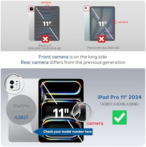 - Solo Compatible con iPad Pro 11 Pulgadas 2024: Tenga en cuenta que la cámara está en el lado largo del dispositivo y verifique la parte posterior inferior de su iPad para verificar y encontrar su número de modelo. NO compatible con otros modelos de iPad Pro 11/iPad Pro 12.9/Serie iPad Air/iPad 10ta 9ta generación
