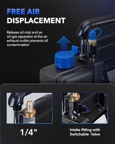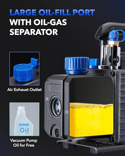 • Package Information: Package includes one 3.5CFM ac vacuum pump, one bottle of 0.23 qt. (250 ml) vacuum oil to get started.Whether you're working on HVAC maintenance, refrigerant system servicing, resin degassing, wood stabilization, or more, this vacuum pump automotive is ideal for both commercial and residential applications