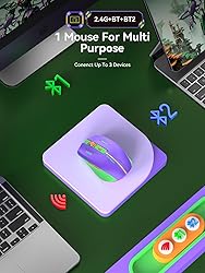 EASY TO CONTROL 3 DEVICE - Dual Bluetooth 5.1 modes and wireless 2.4G technology. It realizes accessible switches between 3 devices by clicking the mode switch button located at the bottom of the mouse. The indication lights of BT1, BT2, and 2.4G USB are green, blue, and red, respectively. Simple & convenient to work from the desktop to the tablet, or laptop to Macbook、iPad, etc. EASY TO CONTROL 3 DEVICE - Dual Bluetooth 5.1 modes and wireless 2.4G technology. It realizes accessible switches between 3 devices by clicking the mode switch button located at the bottom of the mouse. The indication lights of BT1, BT2, and 2.4G USB are green, blue, and red, respectively. Simple & convenient to work from the desktop to the tablet, or laptop to Macbook、iPad, etc. SILENT CLICK & HIGH RESPONSIVENESS - This noiseless mouse reduces the noise by up to 90%, no need to worry about the click sound disturbing others. 3 Adjustable DPI Settings(800, 1200, and 1600)are very precise with every sensitive movement. COMFORTABLE & DURABLE DESIGN - Ergonomic design with an elegant profile. It has 6 buttons including 2 buttons for forward and backward on the left side ideal for both work and gaming. Tested over 5 million times click lifespan ensure long-term stable use. WIDE COMPATIBILITY - The BT 5.1 is compatible with windows 8/10/11 (but not windows 7 or XP), Android, and Mac OS systems; the 2.4G USB connected mode supports any USB-enabled device, which just needs to insert the USB receiver. It Fits desktops, laptops, PC, Macbooks, Chromebook, and Surface pro.