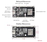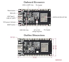 - Board specifications The ESP32-H2-DEV-KIT-N4 is an entry-level RISC-V microcontroller development board integrating Blue-too-th 5 and IEEE 802.15.4 (Zigbee 3.0 and Thread). it is compact in size and powerful, with multiple peripheral interfaces. Suitable for smart home, industrial automation, healthcare, consumer electronics and other applications. Adopts ESP32-H2-MINI-1-N4 module, which is equipped with RISC-V 32-bit single-core processor, up to 96MHz main frequency, built-in 4MB Flash; Integrates rich peripherals including SPI, UART, I2C, I2S, LED PWM, ADC and other interfaces; Onboard CH343 and CH334 USB HUB chips, supports USB and UART development at the same time via a USB-C port. Compatible with the pinout of the ESP32-H2-DevKitM-1 development board, more convenient to use and expand a variety of peripheral modules. Comes with Online Tutorial and Online Development Resource: n9.cl/blqf74 Key features include: 1. Adopts ESP32-H2-MINI-1-N4 module with RISC-V 32-bit single-core processor, up to 96MHz main frequency, built-in 4MB Flash 2. Integrated Blue-too-th 5 and IEEE 802.15.4 (Zigbee 3.0 and Thread) wireless communication, with superior RF performance 3. Type-C connector, easier to use 4. Onboard CH343 and CH334 chips can meet the needs of USB and UART development via a Type-C interface 5. Rich peripheral interfaces, compatible with the pinout of the ESP32-H2-DevKitM-1 development board, offers strong compatibility and expandability 6. Castellated module allows soldering directly to carrier boards 7. Supports a variety of low-power operating states, adjustable communication distance, data rate, and power consumption balance, to meet the power requirements of various application scenarios. Package Content ESP32-H2-DEV-KIT-N4 x1 40PIN male pinheader(black) x2