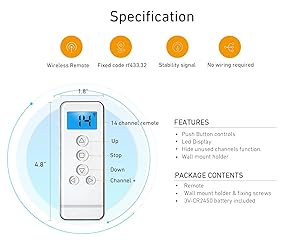 【Attention】Compatible with rollerhouses rf blinds shade motor or replacement with the same shape in your hand, you need to find out what's the brand motor you used before place an order. It will not sync with other brand roller shades 【What You Get】 Welcome guide, and our friendly customer service. Please note It's not compatible with other brand window motorized shade 【Rollerhouses 15 channel remote】 14 blinds separately, from 1 to 14 channel. The "UL" channel provides the ability to control all channels of the remote control at the same time. Perfect for individual shade, group room and whole home shade control 【Remote control for specific use】 Excellent for any space with large windows, multiple windows, or for the simple convenience and child-safe method of operating shades 【Remote for blinds】Raise, lower and tilt your shades with the touch of a button. No more fiddling with cords or manually adjusting each shade
