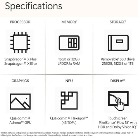 * Some Copilot+ PCs require download of free updates to run Copilot+ PC experiences, available starting late 2024 – 2025. See aka.ms/copilotpluspcs ** Pre-release screen shown; subject to change. *** Availability of Copilot+ PC features varies by device and market. [1] Based on Cinebench 2024 Multi-threaded conducted by Microsoft in April 2024 comparing pre-release build of Surface Laptop 13.8" and 15” with Snapdragon X Elite running pre-release Windows 11 26100 and Apple MacBook Air 13.6" and 15” with M3 running macOS 14 Sonoma. [2] Optimized for select languages (English, Chinese (simplified), French, German, Japanese, and Spanish. Content-based and storage limitations apply. Recall is coming soon through a post-launch Windows Update. See https://aka.ms/copilotpluspcs. [3] Colors available on selected models only. Available colors, sizes, finishes, and processors may vary by store, market, and configuration. [4] Surface Laptop, excluding power supply, contains a minimum of 25% recycled content. Based on validation performed by Underwriter Laboratories, Inc. using Environmental Claim Validation Procedure for Recycled Content, UL 2809-2, Second Edition, November 7, 2023.  [5] Currently supports translation for video and audio subtitles into English from 40+ languages. See https://aka.ms/copilotpluspcs. [6] Battery life varies significantly based on device configuration, usage, network and feature configuration, signal strength, settings and other factors. See aka.ms/SurfaceBatteryPerformance for details. [7] 13.8" Surface Laptop comes with 39 W Surface power supply. Fast charging (from 5% to 80%) is supported with minimum 65W Surface power supply or USB-C® PD charger, sold separately. Testing was conducted at Microsoft in February 2024, using pre-production devices, software, and minimum of 65W USB-C® charger under controlled conditions. The device was powered on to the desktop screen with default display brightness settings. Actual charge time will vary based on operating conditions. Measured at typical office ambient temperature of 23C.   [8] Enclosure includes A Cover, C Bucket and D Cover. 100% recycled aluminum alloy in A Cover and C Bucket. 100% recycled rare earth metals in magnets. Based on validation performed by Underwriter Laboratories, Inc. using Environmental Claim Validation Procedure (ECVP) for Recycled Content, UL 2809-2, Second Edition, November 7, 2023.  [9] Enclosure includes A Cover, C Bucket and D Cover. Based on validation performed by Underwriter Laboratories, Inc. using Environmental Claim Validation Procedure for Recycled Content, UL 2809-2, Second Edition, November 7, 2023. [10] Available colors may vary by market. [11] USB-C® port does not charge your Surface device or any device that requires more than 15W [12] Requires device with USB-C® USB4®/Thunderbolt™ 4 port and when supported by device and display. *Screens simulated; subject to change *Recall: Optimized for select languages (English, Chinese (simplified), French, German, Japanese, and Spanish.) Content-based and storage limitations apply. See [https://aka.ms/copilotpluspcs]. *Cocreator: Optimized for English text prompts See [https://aka.ms/copilotpluspcs]