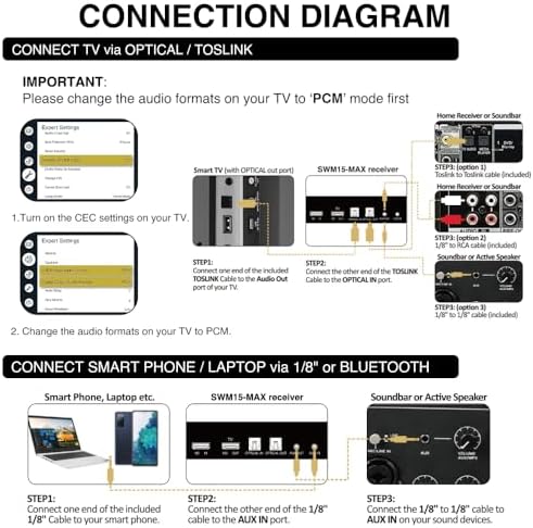 - SOUND TOWN SWM15-MAX - VERSATILE COMPATBILITY: The Sound Town SWM15-MAX features HD (TV Arc), Bluetooth, Optical (Toslink), and 3.5mm AUX inputs & outputs, ensuring it works with smart TVs, home receivers, and sound bars. It also has 1/4" mono jacks for dynamic mics and instruments such as electric guitars