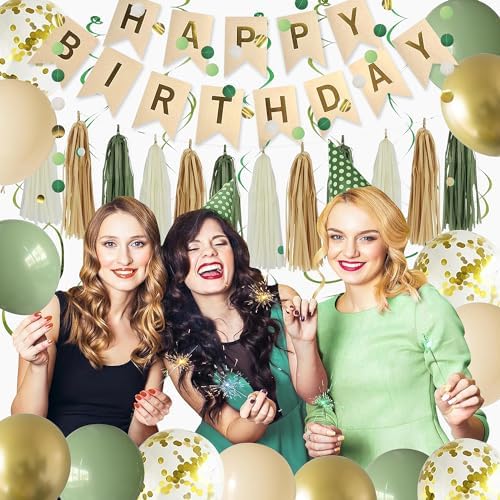 Green Birthday Party Decorations for Women Girls with Happy Birthday Banner,Tissue Paper Pompoms, Paper Tassel,Circle Garland,Hanging Swirl,Decorations Balloons for Party Decor (sage green)