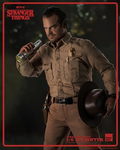 From Threezero. Jim Hopper is the chief of police in the small town of Hawkins, Indiana, from the popular Netflix series Stranger Things. He is a tough cop with a gruff personality. The Stranger Things - 1/6 Jim Hopper collectible figure stands approximately 12.5" tall features a fully-articulated 1/6 original body with approximately 35 points of articulation. This collectible figure showcases precisely sculpted details and weathering effects, effectively capturing the powerful and tough presence of Jim Hopper. The highly-detailed figure includes one head sculpt with a likeness to the character's appearance, seven interchangeable hands and various accessories for different poses.