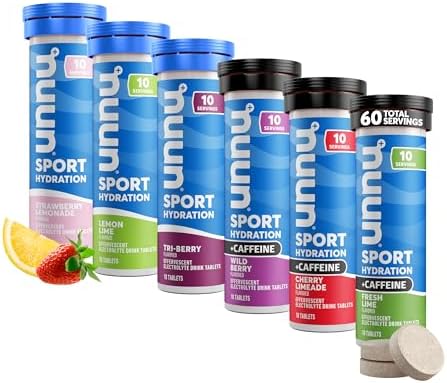- GREAT-TASTING ELECTROLYTE TABLETS: This Nuun Sport 6 pack contains 1 tube of each refreshing flavor: Strawberry Lemonade, Lemon Lime, Tri-Berry, Sport + Caffeine Wild Berry, Sport + Caffeine Cherry Limeade, and Sport + Caffeine Fresh Lime for a total of 60 servings