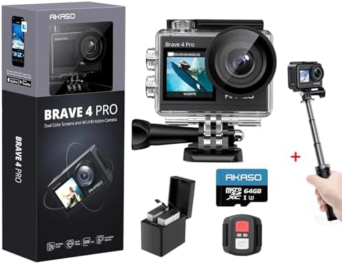 AKASO Brave 4 Pro Action Camera with 64GB MicroSDXC Memory Card and Mini Selfie Stick Tripod