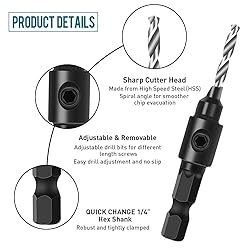 - 5 Piece Countersink Drill Bit Set for Woodworking, Fixinus 1/4” Hex Shank HSS Counterbore Hole Drill Bit, 5/6/8/10/12# Counter Sinker Set with L Wrench 【Product Features】 1. Made of high speed steel (HSS) for long life. 2. Drill a pilot hole and countersink for the head of the screw or countersink for the plug in one step. 3. Precision machined quick change chuck, suitable for impact drills and other power tools that can accept a 1/4'' hex shank. 【Product Parameters】 - Material: HSS 4241 - Size: #5, #6, #8, #10, #12 - Woodworking Chamfer: High Speed Steel - Feature of The Shank: 1/4” Hexagonal Shank - Suitable for: Soft Metal, Insulation Board, PVC Board, Wood Board, etc. 【Package Contents】 1 x #5 Countersink Drill Bit 1 x #6 Countersink Drill Bit 1 x #8 Countersink Drill Bit 1 x #10 Countersink Drill Bit 1 x #12 Countersink Drill Bit 1 x L Wrench